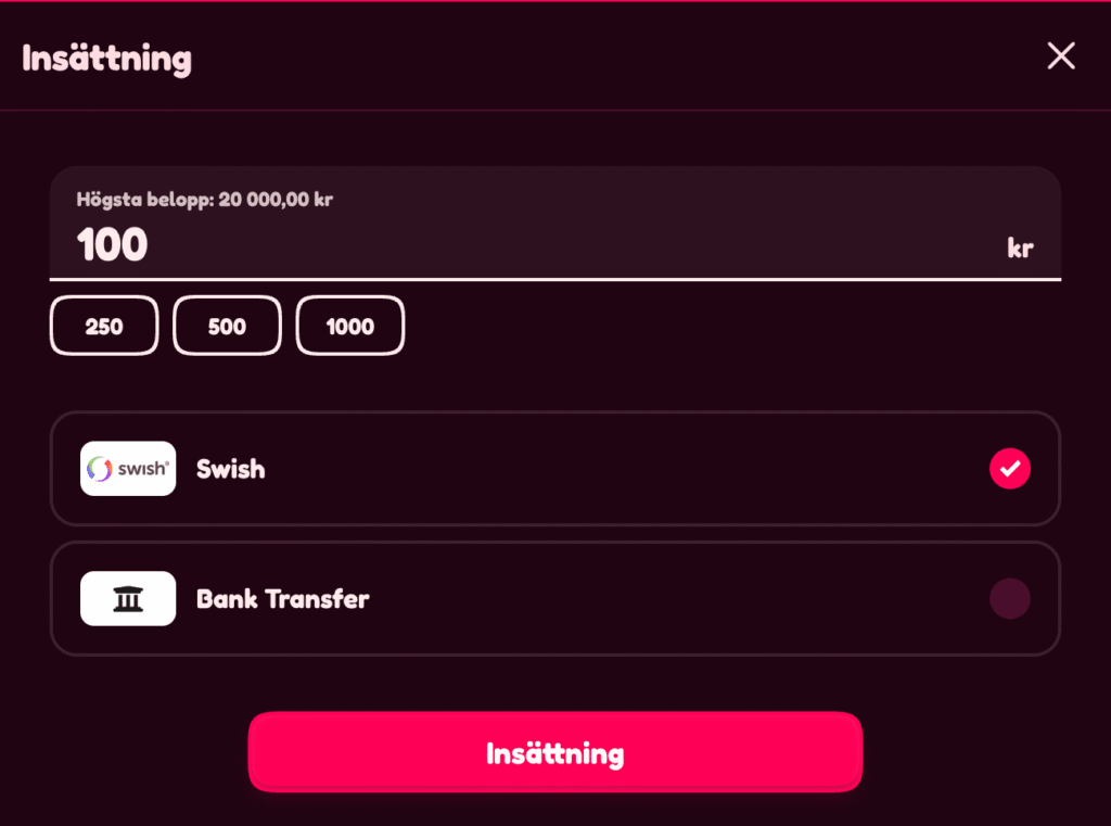 Swish och Zimpler är två snabba och moderna betalningsmetoder som i mitt tycke är tillräckliga för insättningar och uttag.