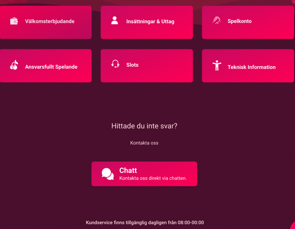 Kundtjänsten har inte öppet dygnet runt men däremot finns det en FAQ-avdelning med många svar på vanliga frågor. Ta kontakt med supporten via chatt eller e-post mellan 08:00 och 00:00