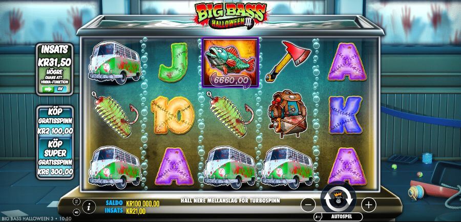 Free spins, multiplikatorer och blodiga handavtryck!Pragmatic Play och Reel Kingdom är tillbaka och tar Halloween-fisken till nya, kusligt underhållande nivåer! I Big Bass Halloween 3 bjuds vi på Zombier, blodiga handavtryck och folkabussar där free spins och multiplikatorer blandas i ett akvarium fullt av spänning. Om du gillade de tidigare Big Bass-slotsen kan du räkna med liknande action i en snyggare förpackning!