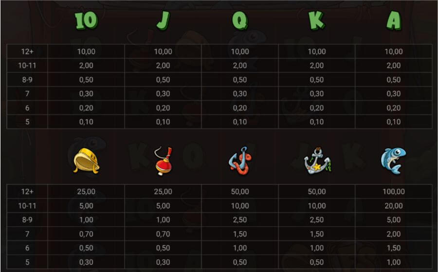 Totalt finns det 10 betalande symboler i spelet. Symbolerna som kan ge vinst är kortsymbolerna 10 till A, fiskarmössor, flöten, krokar, ankare och fiskar.